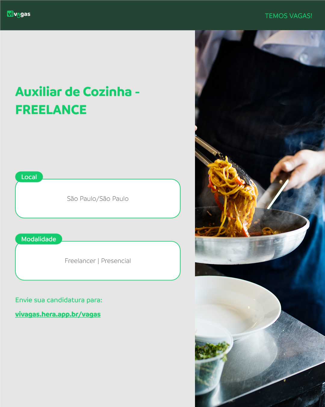 (Vaga para Banco de Talentos) O Auxiliar de Cozinha é responsável por apoiar a equipe na preparação de alimentos, garantindo a organização e a limpeza do ambiente de trabalho. Este profissional deve seguir as normas de segurança alimentar e auxiliar na montagem de pratos, além de realizar a higienização de utensílios e equipamentos. É fundamental ter atenção aos detalhes e trabalhar em equipe, contribuindo para a eficiência do serviço e a satisfação dos clientes. Buscamos um(a) candidato(a) comprometido(a) e proativo(a) para integrar nosso time.