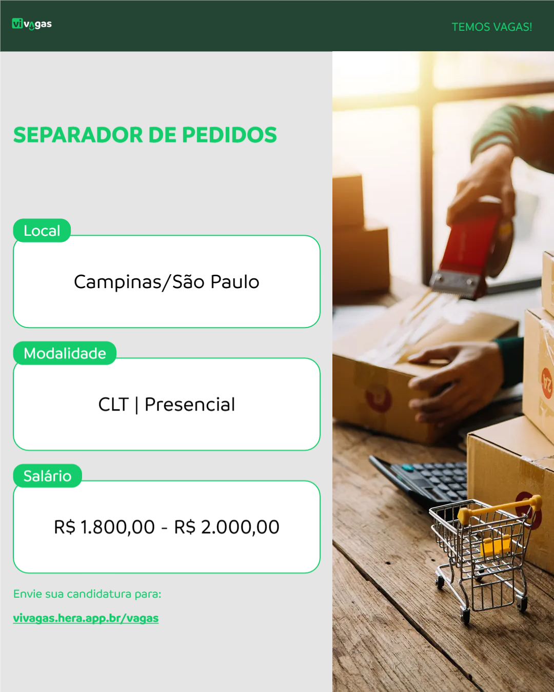 O(a) Separador(a) de Pedidos ( Banco de Talentos) atuará na organização e separação de produtos para atender às demandas dos clientes. Este profissional será responsável por garantir a precisão na separação dos itens, seguindo as orientações estabelecidas e utilizando ferramentas adequadas para otimizar o processo. É fundamental ter atenção aos detalhes e habilidades de trabalho em equipe, contribuindo para a eficiência do fluxo de pedidos e a satisfação dos clientes.